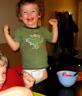 How can he dislike a crazy truck-touching outing so much and yet react like this to me giving him a bowl of watermelon?: